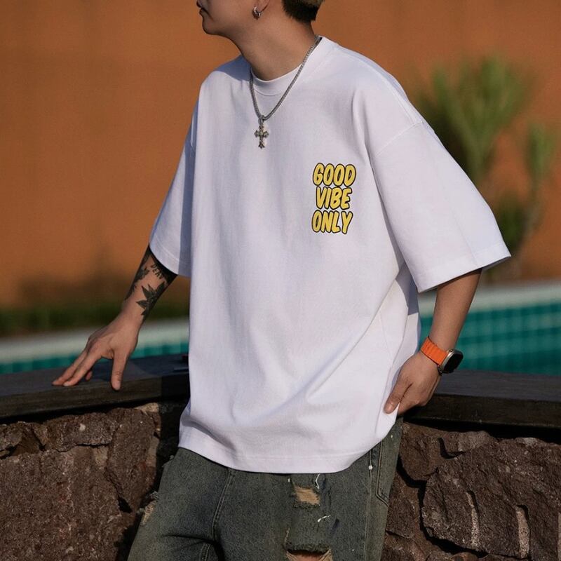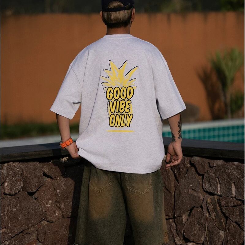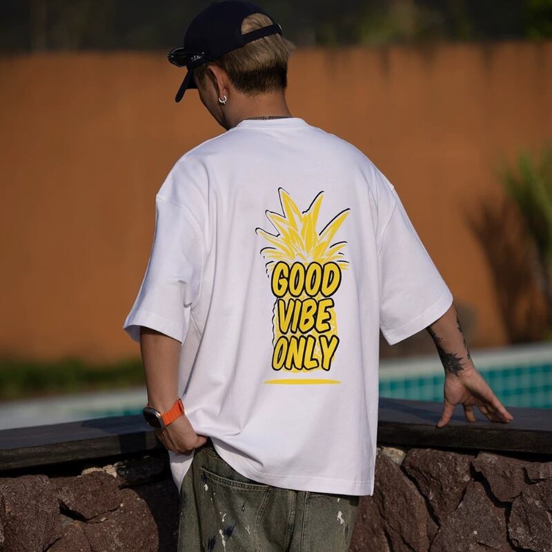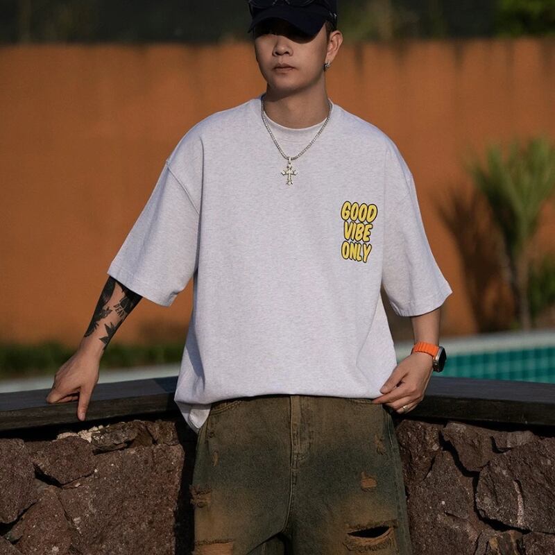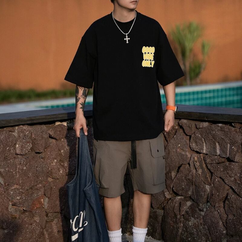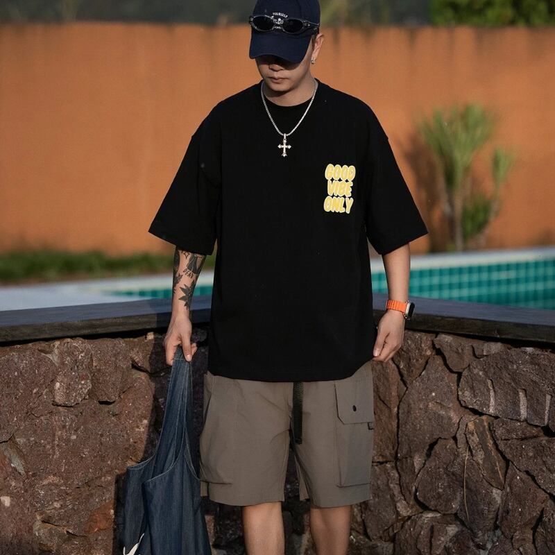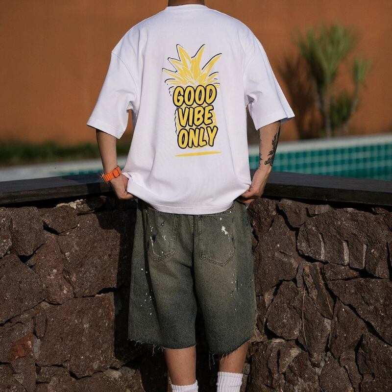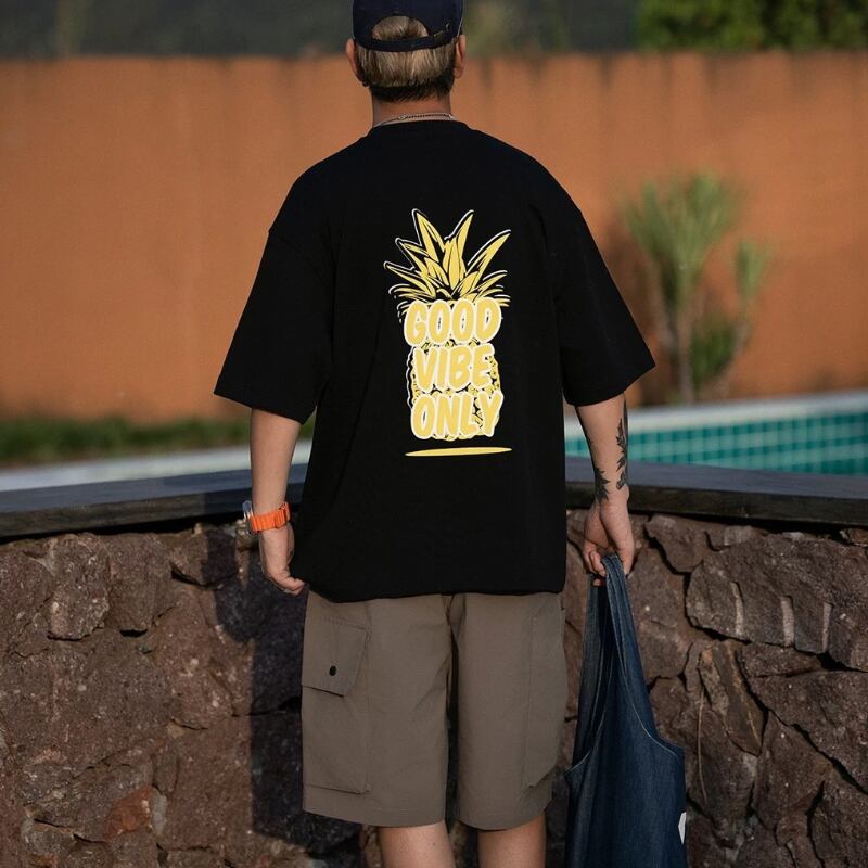 独特のバックプリントが目を引く、レトロな雰囲気のTシャツです。胸元と背中に施された黄色い文字がアクセントとなり、カジュアルながら個性的なスタイルを演出します。デイリーユースはもちろん、おしゃれなコーディネートの主役としても活躍する一着です。シンプルなボトムスと合わせるだけで、こなれた感じを楽しむことができます。