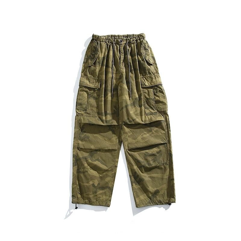 【商品管理番号】 M0097 【商品説明】 ウエストゴムで着脱がしやすいカーゴパンツです。カモフラージュ柄が印象的で、ワイドシルエットが特徴の一着です。裾のドローストリングがアクセントとなり、様々なスタイリングにマッチするアイテムです。デイリーコーデはもちろん、アウトドアシーンでも活躍すること間違いなし!お好みに合わせて裾のシルエットを調整できる楽しみも魅力です。 GREEN/KHAKI/PURPLE 【サイズ】 【S】 ウエスト:64cm / 着丈:101cm / ヒップ:112cm / 裾まわり:50cm 【M】 ウエスト:67cm / 着丈:102cm / ヒップ:116cm / 裾まわり:51cm 【L】 ウエスト:70cm / 着丈:103cm / ヒップ:120cm / 裾まわり:52cm 【XL】 ウエスト:73cm / 着丈:104cm / ヒップ:124cm / 裾まわり:53cm 【2XL】 ウエスト:77cm / 着丈:106cm / ヒップ:129cm / 裾まわり:54cm ※サイズは測り方により1-3㎝の誤差が生じる場合がございます。 【素材】 cotton100%