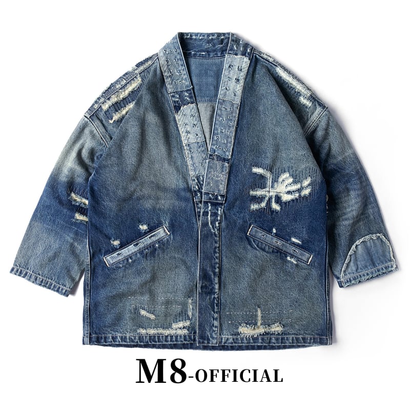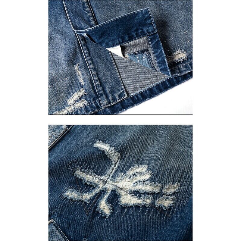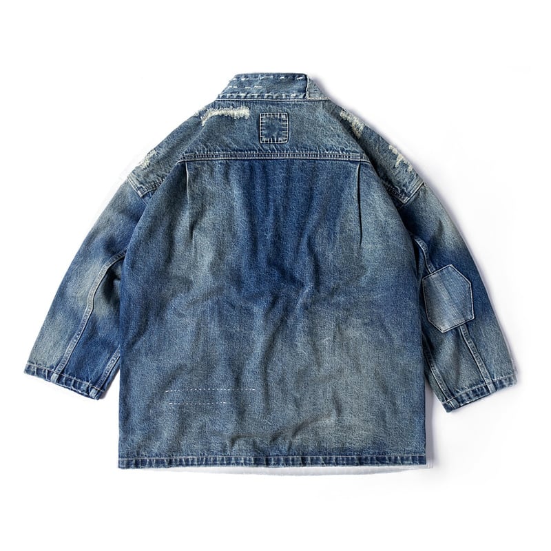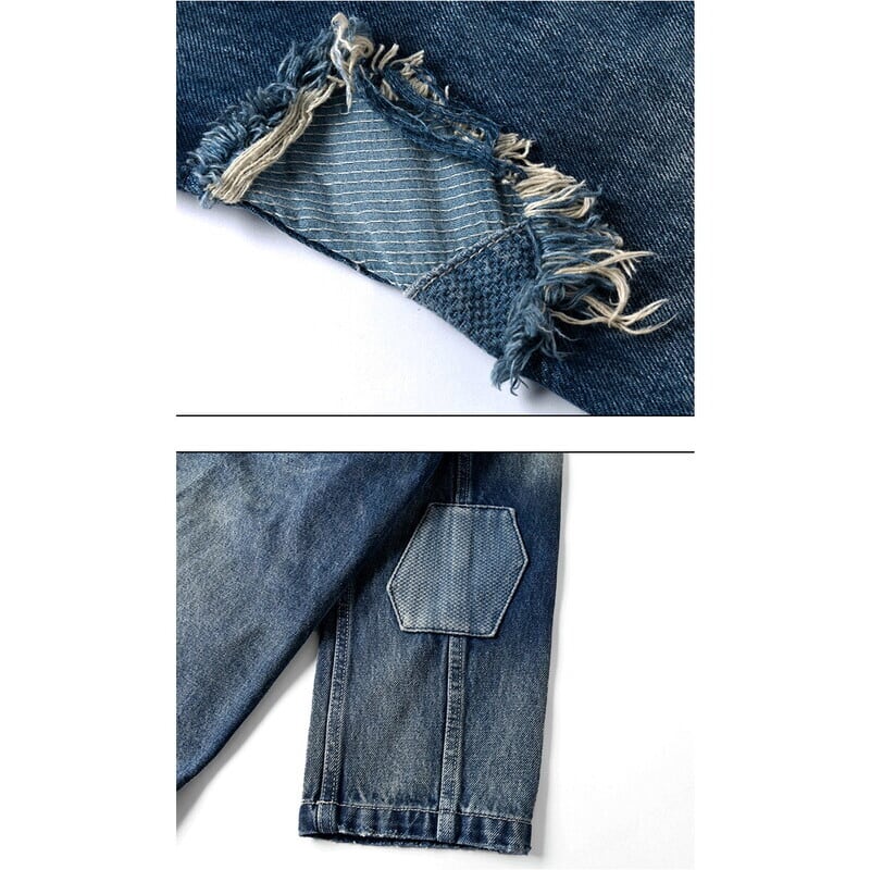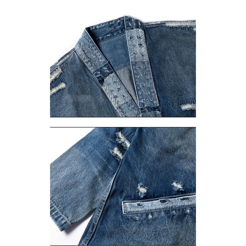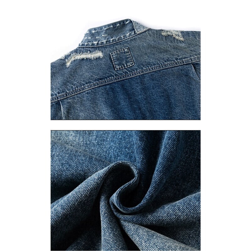 【商品管理番号】 M0234 【商品説明】 ヴィンテージ調のエイジング加工が施されたノーカラーデニムジャケットです。パッチワークやダメージ加工がアクセントになり、個性的な印象を与える一着。カジュアルなスタイルから、ちょっとしたお出かけまで幅広くコーディネートできるアイテムです。着こなしの幅を広げる、使い勝手の良いデニムジャケットです。 BLUE 【サイズ】 【S】肩幅:62cm / 胸囲:130cm / 着丈:71cm / 袖丈:43.5cm 【M】肩幅:64cm / 胸囲:134cm / 着丈:73cm / 袖丈:44.5cm 【L】肩幅:66cm / 胸囲:138cm / 着丈:75cm / 袖丈:45.5cm 【XL】肩幅:68cm / 胸囲:142cm / 着丈:77cm / 袖丈:46.5cm ※サイズは測り方により1-3㎝の誤差が生じる場合がございます。 【素材】 cotton100%