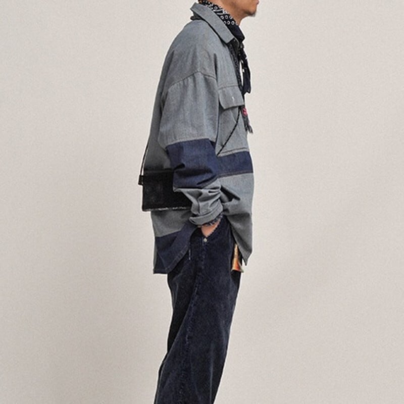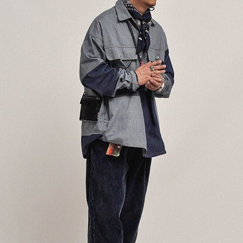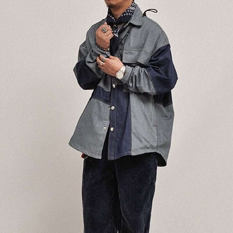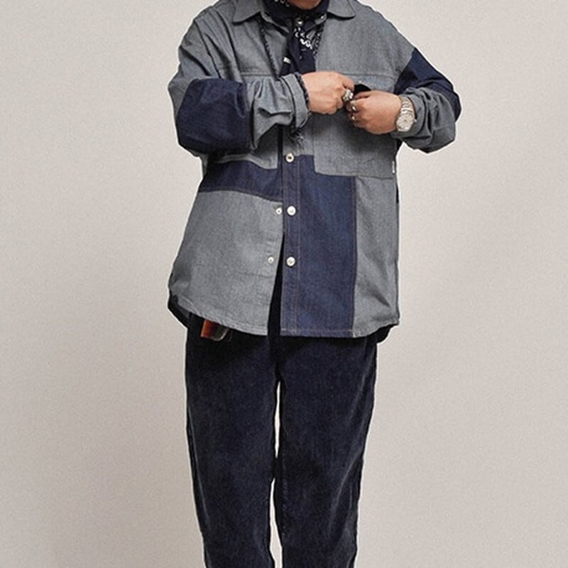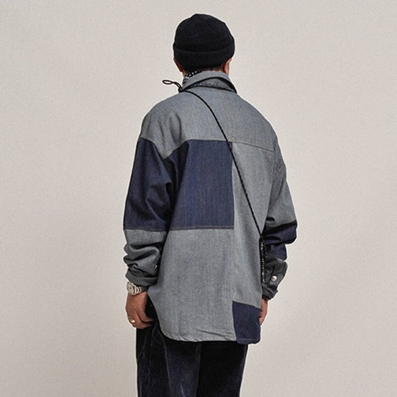 個性的なパッチワークデザインが印象的なアシンメトリーシャツです。