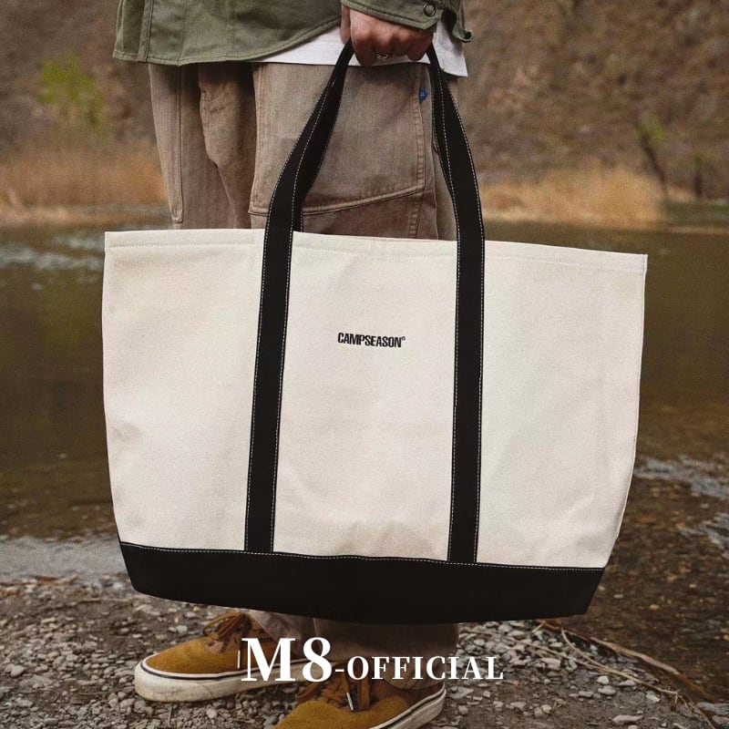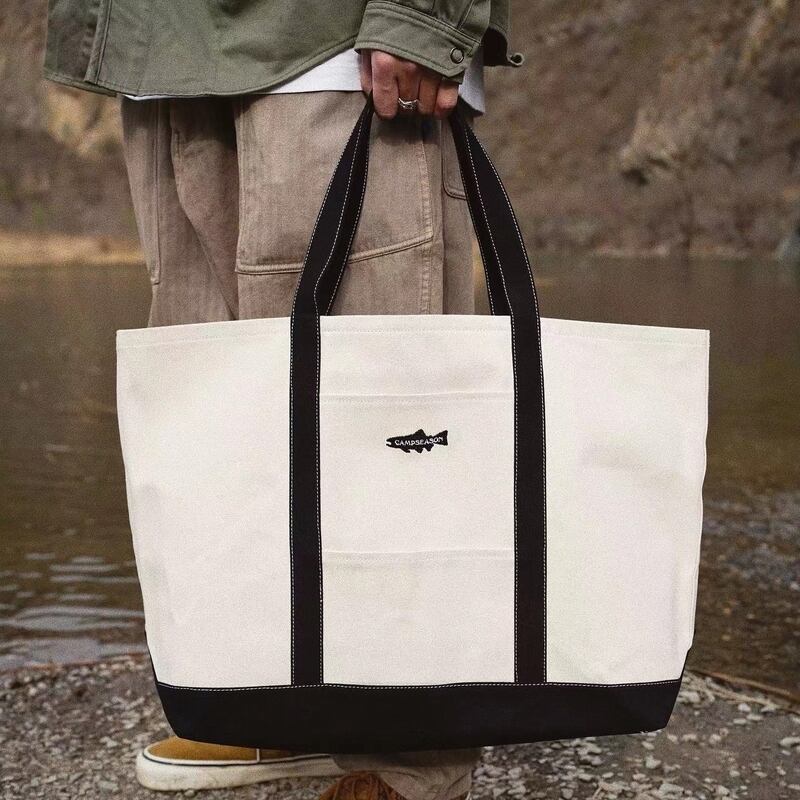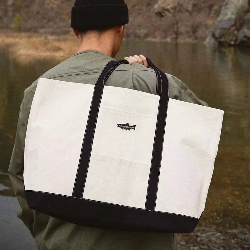 ヘビーキャンバス製のトートバッグが新登場!大容量でありながら、シンプルなモノトーン配色が魅力的で、スタイルを選ばず使いやすい一品です。レタリングとフィッシュの刺繍がさりげなくあしらわれており、アクセントとなっているのがポイント。デイリー使いはもちろん、旅行やお買い物シーンにもぴったりな便利なアイテムです。
