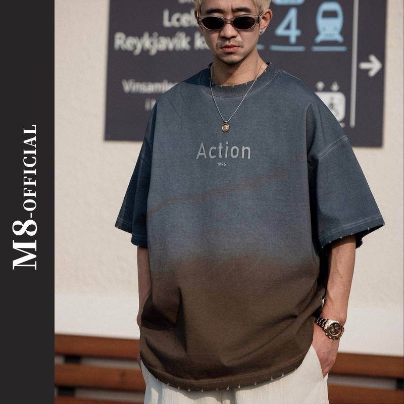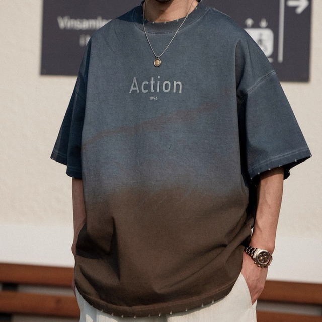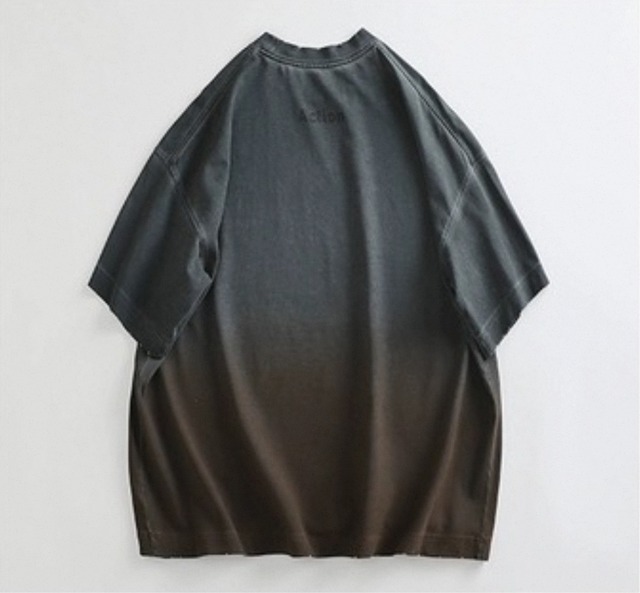 【商品管理番号】 M0149 【商品説明】 グレーからブラックへのグラデーションが印象的なTシャツ。胸元の「Action」ロゴがさりげないアクセントに。ややくすんだ風合いがシンプルながらも雰囲気のある一枚です。 GLAY 【サイズ】 【M】肩幅:61.6cm / 胸囲:118cm / 着丈:68cm / 袖丈:21cm 【L】肩幅:62.8cm / 胸囲:122cm / 着丈:70cm / 袖丈:21.5cm 【XL】肩幅:64cm / 胸囲:126cm / 着丈:72cm / 袖丈:22cm 【2XL】肩幅:65.2cm / 胸囲:130cm / 着丈:74cm / 袖丈:22.5cm モデル身長:175㎝/体重:60㎏/着用サイズ:Mサイズ ※サイズは測り方により1-3㎝の誤差が生じる場合がございます。 【素材】 cotton100%