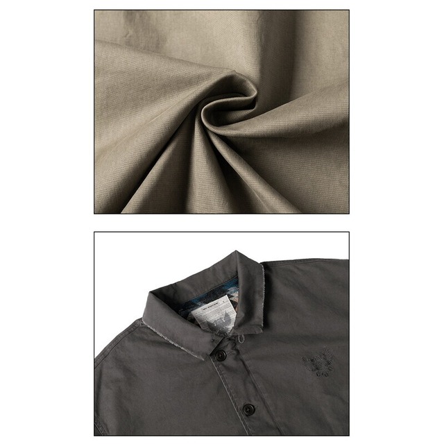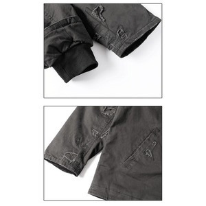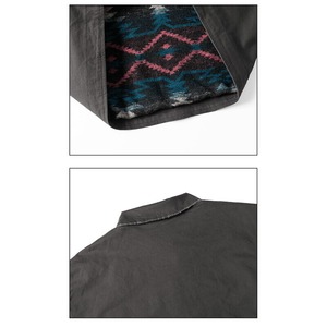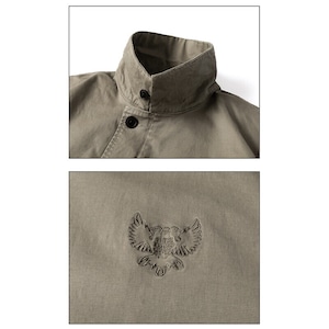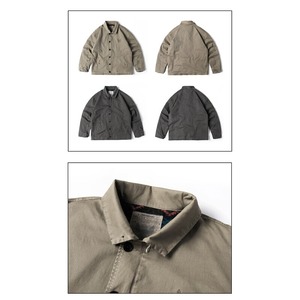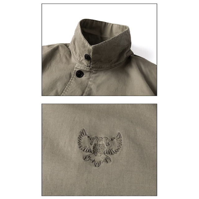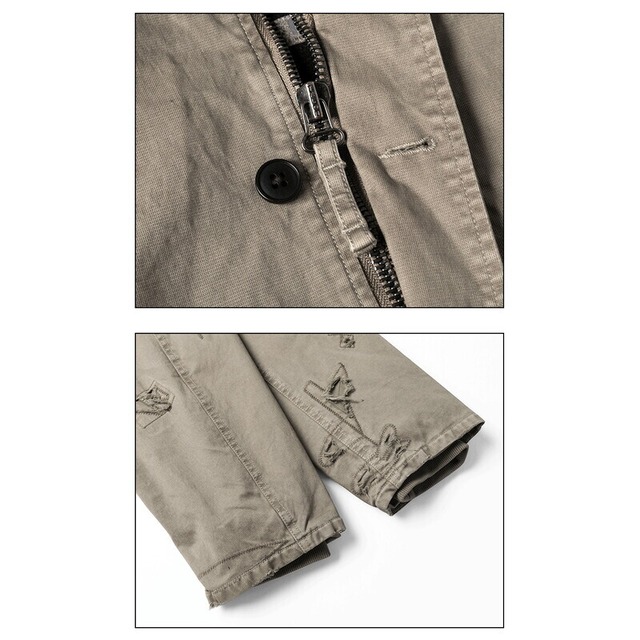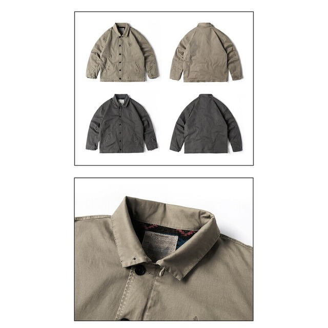 【商品管理番号】 M0366 【商品説明】 ヴィンテージ調のダメージ加工が施されたこなれた長袖ジャケットです。さりげないワンポイント刺しゅうがアクセントになり、裏地の配色が個性的な印象を与える一着。カジュアルなスタイルから、ちょっとしたお出かけまで幅広くコーディネートできるアイテムです。着こなしの幅を広げる使い勝手の良いジャケットです。 KHAKI/DARKGRAY 【サイズ】 【S】肩幅:57cm / 胸囲:126cm / 着丈:70cm / 袖丈:58cm 【M】肩幅:59cm / 胸囲:130cm / 着丈:72cm / 袖丈:59cm 【L】肩幅:61cm / 胸囲:134cm / 着丈:74cm / 袖丈:60cm 【XL】肩幅:63cm / 胸囲:138cm / 着丈:76cm / 袖丈:61cm ※サイズは測り方により1-3㎝の誤差が生じる場合がございます。 【素材】 cotton100%