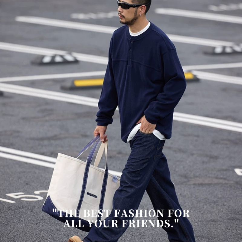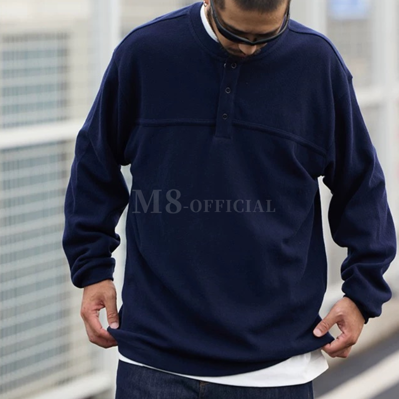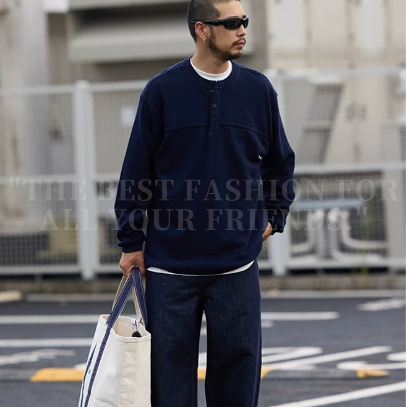 【商品管理番号】 M0378 【商品説明】 落ち着いたネイビーカラーのヘンリーネックプルオーバー。 フロントのボタンデザインがアクセントとなり、シンプルながら存在感のある一枚です。 ゆったりとしたシルエットで、インナーとのレイヤードもしやすく、デイリーに活躍します。 NAVY 【サイズ】 【S】肩幅:49cm / 胸囲:114cm / 着丈:66cm / 袖丈:53cm 【M】肩幅:51cm / 胸囲:118cm / 着丈:68cm / 袖丈:53.5cm 【L】肩幅:53cm / 胸囲:122cm / 着丈:70cm / 袖丈:54cm 【XL】肩幅:55cm / 胸囲:126cm / 着丈:72cm / 袖丈:54.5cm モデル身長:175㎝/体重:63㎏/着用サイズ:Mサイズ ※サイズは測り方により1-3㎝の誤差が生じる場合がございます。 【素材】 cotton96%/polyester4%