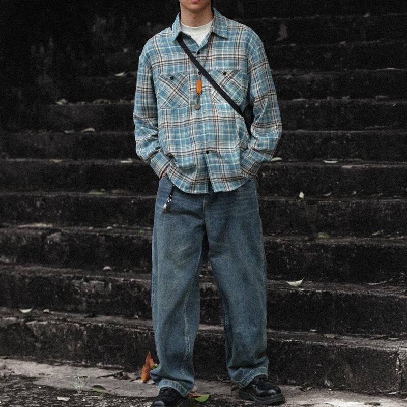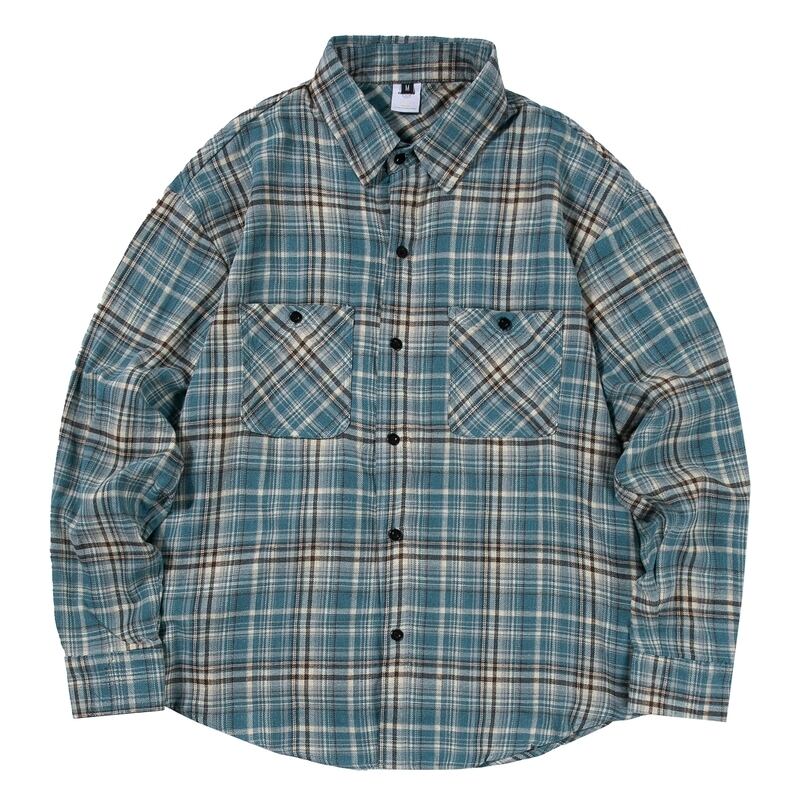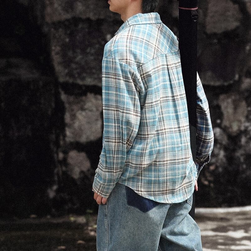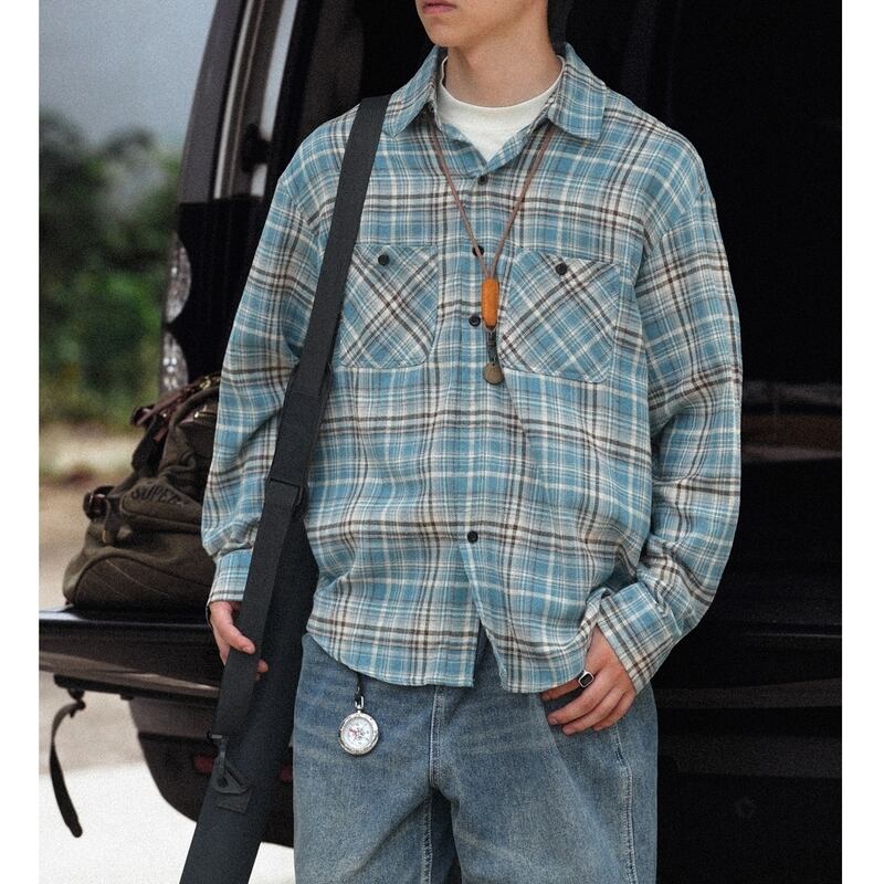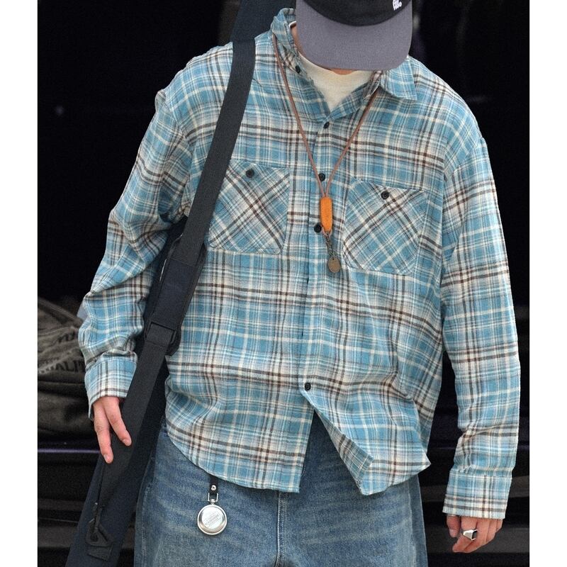 【商品管理番号】 M0405 【商品説明】 ダブルポケット付きのレトロなチェック柄のシャツ。リラックス感のあるシルエットに仕上げ、デイリーに取り入れやすい一枚です。胸ポケットがさりげないアクセントになり、羽織りとしてもレイヤードとしても使いやすい万能アイテム。カジュアルからストリートまで幅広いスタイルにフィットします。 BLUE 【サイズ】 【M】肩幅:54cm / 胸囲:124cm / 着丈:74cm / 袖丈:60cm 【L】肩幅:55cm / 胸囲:128cm / 着丈:76cm / 袖丈:61cm 【XL】肩幅:56cm / 胸囲:132cm / 着丈:78cm / 袖丈:62cm 【2XL】肩幅:57cm / 胸囲:136cm / 着丈:80cm / 袖丈:63cm モデル身長:176㎝/体重:62.5㎏/着用サイズ:L-XLサイズ ※サイズは測り方により1-3㎝の誤差が生じる場合がございます。 【素材】 cotton100%