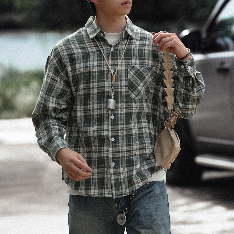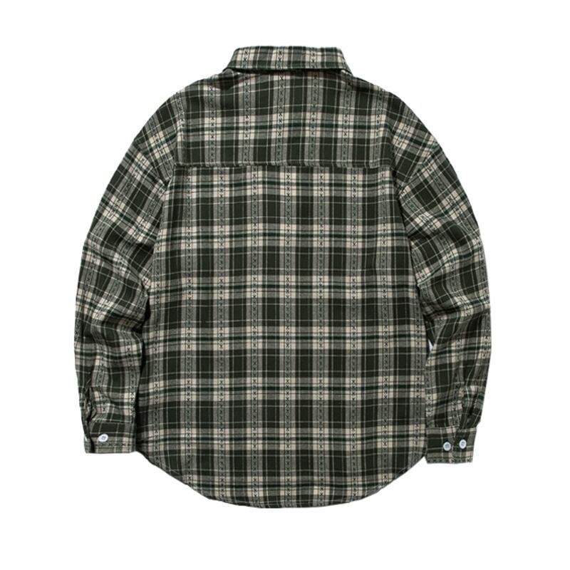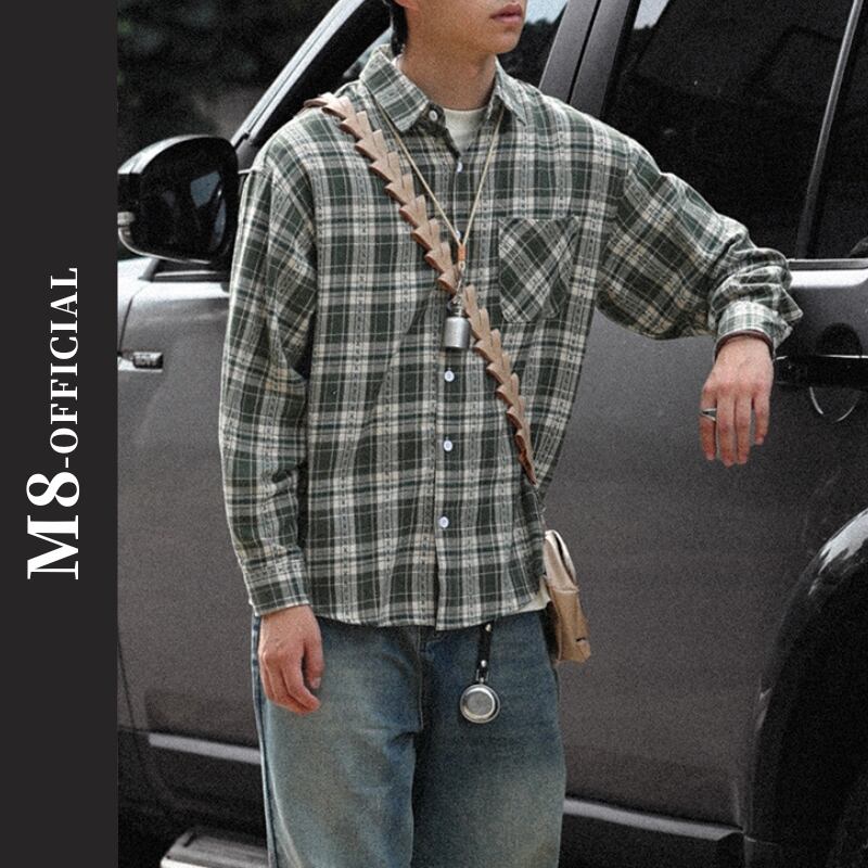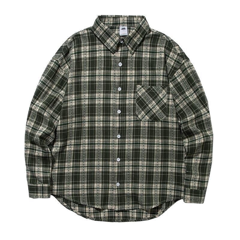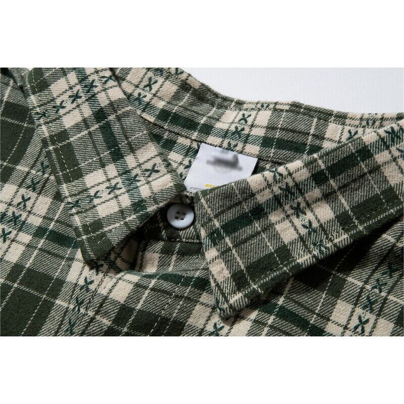 【商品管理番号】 M0408 【商品説明】 ステッチ入のチェックパターンがレトロなポケット付きシャツ。リラックス感のあるシルエットに仕上げ、デイリーに取り入れやすい一枚です。胸ポケットがさりげないアクセントになり、羽織りとしてもレイヤードとしても使いやすい万能アイテム。カジュアルからストリートまで幅広いスタイルにフィットします。 GREEN 【サイズ】 【M】肩幅:51cm / 胸囲:118cm / 着丈:72cm / 袖丈:54cm 【L】肩幅:52cm / 胸囲:122cm / 着丈:74cm / 袖丈:55cm 【XL】肩幅:53cm / 胸囲:126cm / 着丈:76cm / 袖丈:56cm 【2XL】肩幅:54cm / 胸囲:130cm / 着丈:78cm / 袖丈:57cm モデル身長:176㎝/体重:62.5㎏/着用サイズ:L-XLサイズ ※サイズは測り方により1-3㎝の誤差が生じる場合がございます。 【素材】 cotton100%