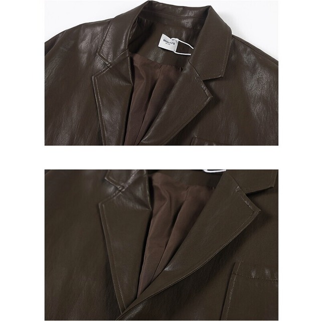【商品管理番号】 M0423 【商品説明】 ワイドなシルエットが特徴のフェイクレザー仕立てのテーラードジャケットが登場です! こなれた印象を与えるデザインで、オフィスからカジュアルな日常まで幅広いシーンで活躍します。シンプルなトップスと合わせるだけで、スタイリッシュなコーディネートが完成。トレンド感を押さえつつ、快適さも兼ね備えた一着です。 BLACK/BROWN 【サイズ】 【S】肩幅:61cm / 胸囲:134cm / 着丈:76cm / 袖丈:54cm 【M】肩幅:63cm / 胸囲:138cm / 着丈:78cm / 袖丈:55cm 【L】肩幅:65cm / 胸囲:142cm / 着丈:80cm / 袖丈:56cm 【XL】肩幅:67cm / 胸囲:146cm / 着丈:82cm / 袖丈:57cm ※サイズは測り方により1-3㎝の誤差が生じる場合がございます。 【素材】 rayon50%/polyurethane45%/polyester5%