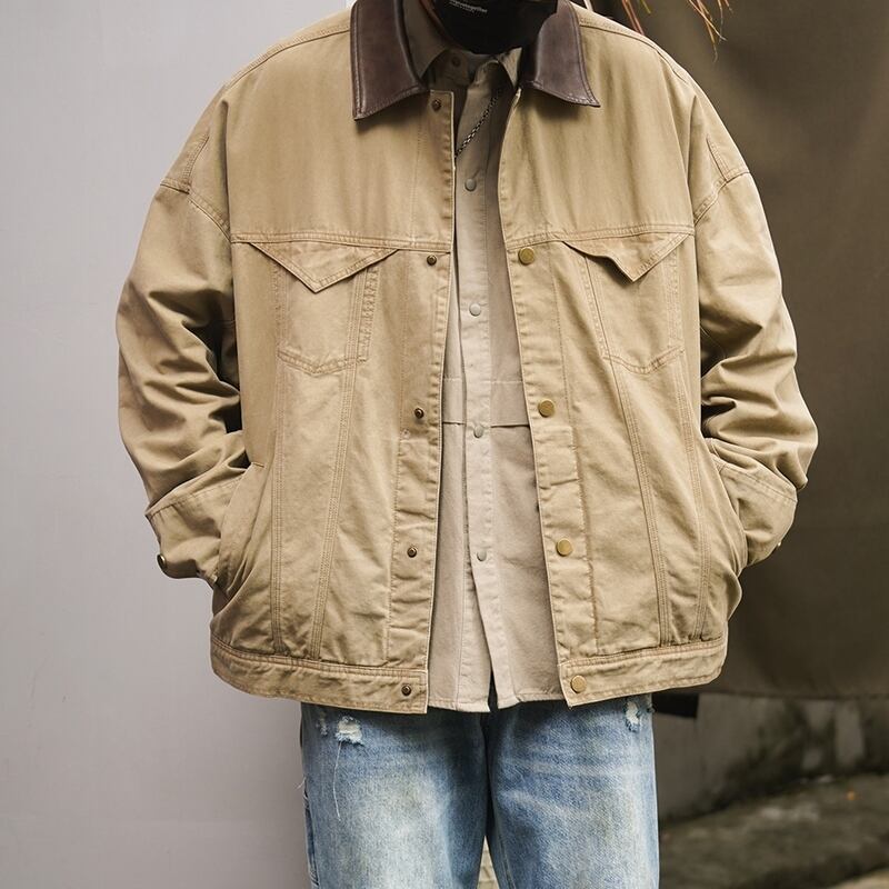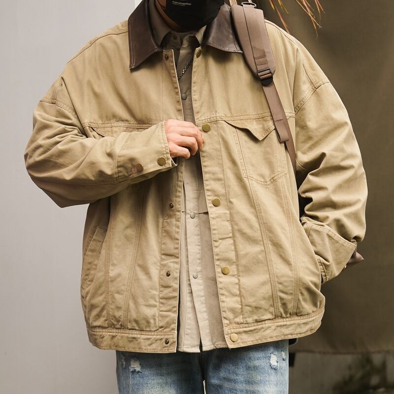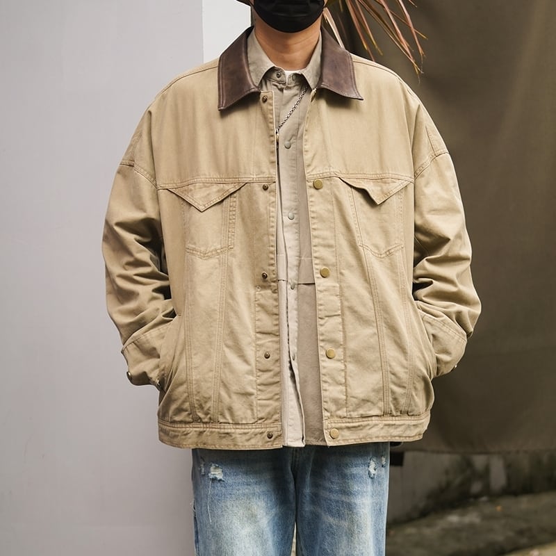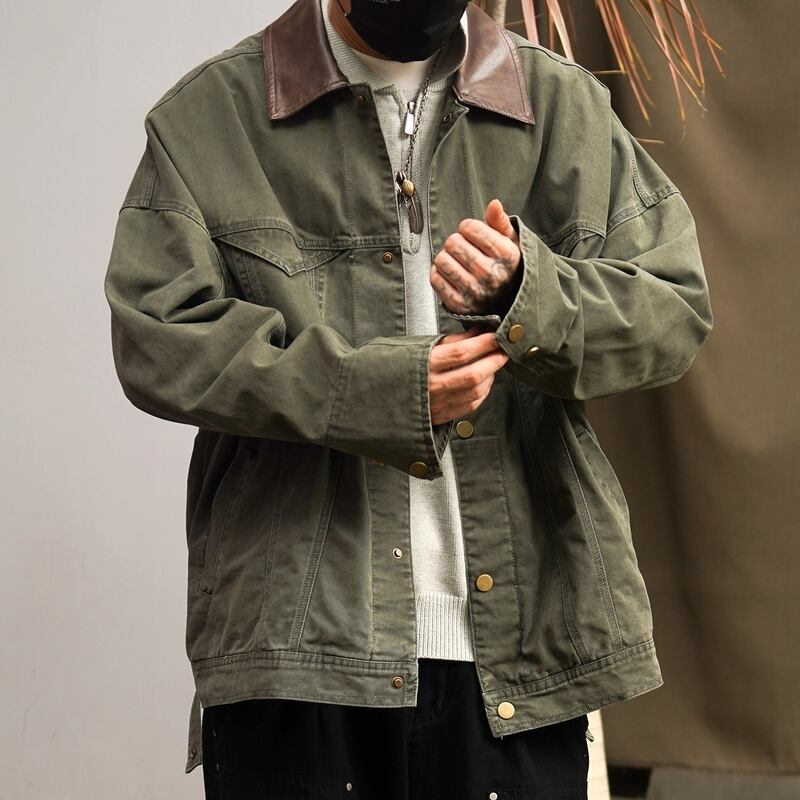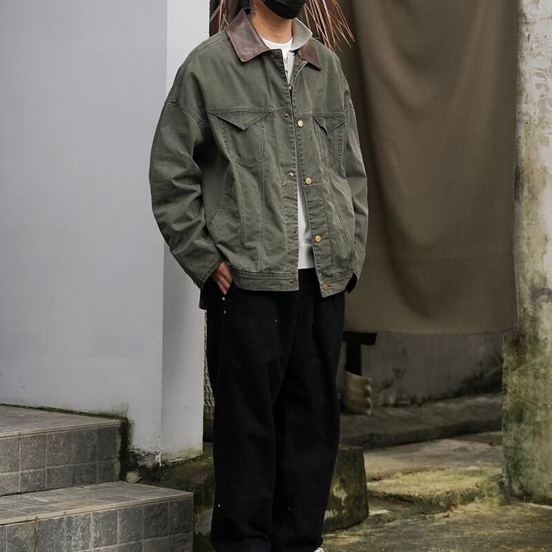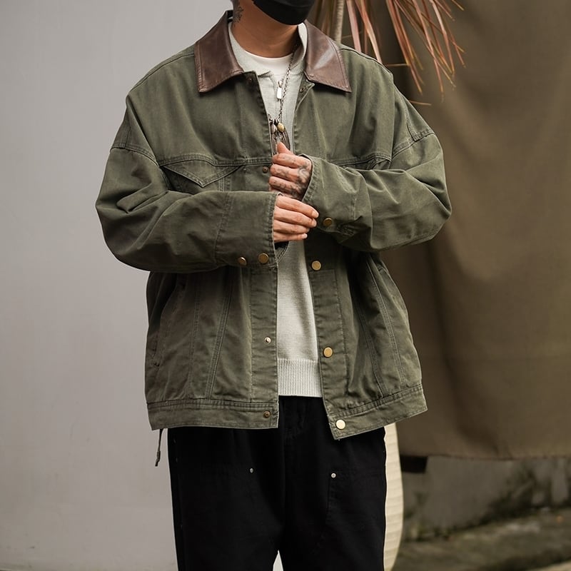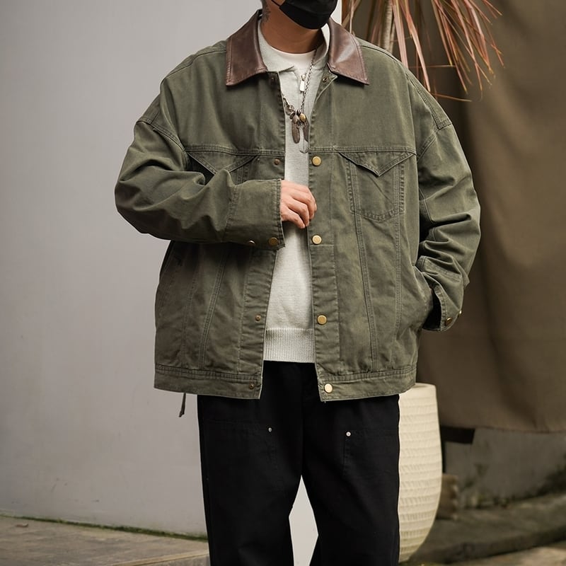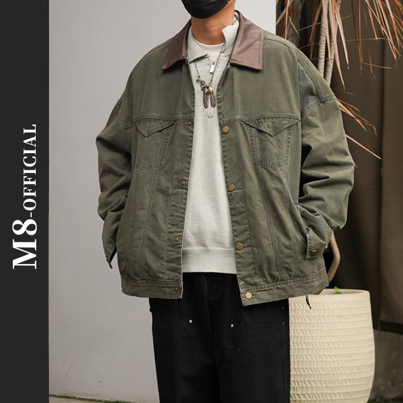 【商品管理番号】 M0472 【商品説明】 襟をフェイクレザーで仕立てた、絶妙なヴィンテージ風スタイルがこなれたドロップショルダージャケットです。ツートーンにあしらったクレリックカラーが個性的な印象を与える一着。カジュアルなスタイルから、ちょっとしたお出かけまで幅広くコーディネートできるアイテムです。着こなしの幅を広げる、使い勝手の良いジャケットです。 GREEN/BEIGE 【サイズ】 【M】肩幅:69cm / 胸囲:130cm / 着丈:68.5cm / 袖丈:52cm 【L】肩幅:71.5cm / 胸囲:135cm / 着丈:72cm / 袖丈:53cm 【XL】肩幅:73cm / 胸囲:138cm / 着丈:74cm / 袖丈:54cm 【2XL】肩幅:75.5cm / 胸囲:144cm / 着丈:76cm / 袖丈:55cm ※サイズは測り方により1-3㎝の誤差が生じる場合がございます。 【素材】 cotton100%
