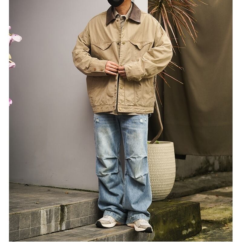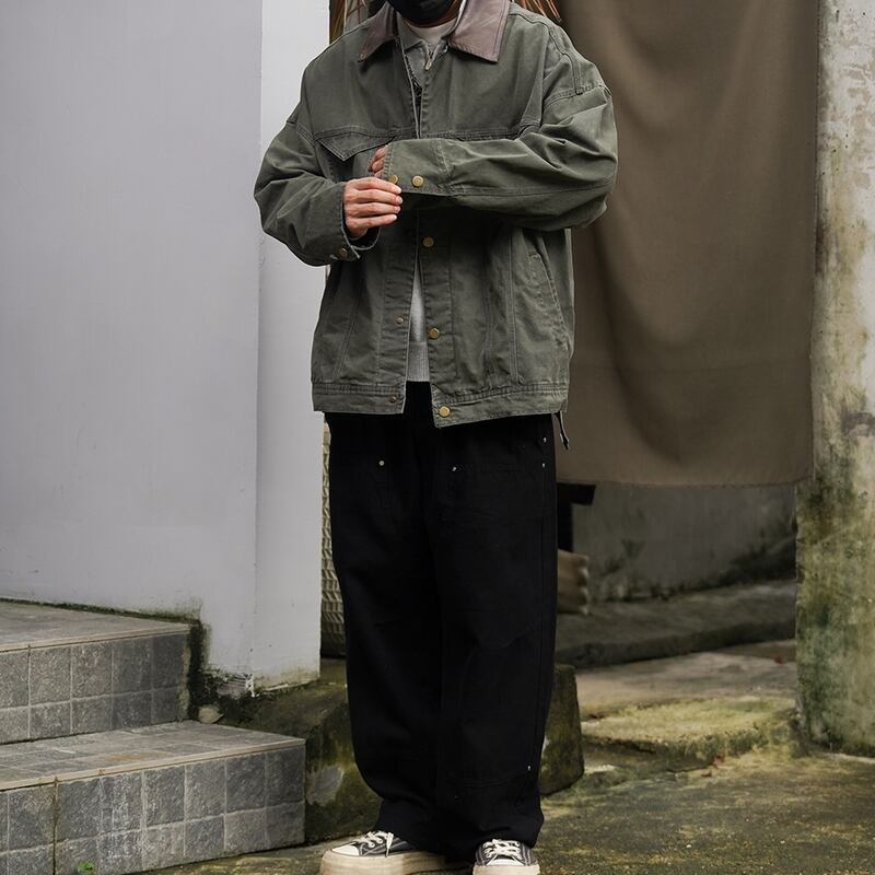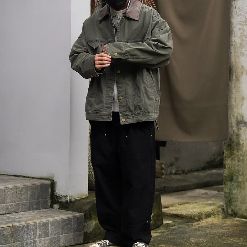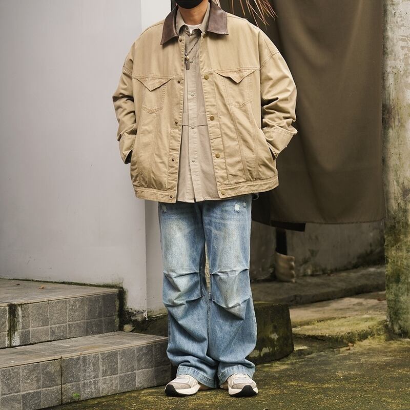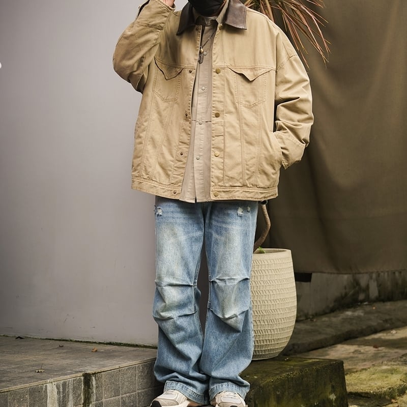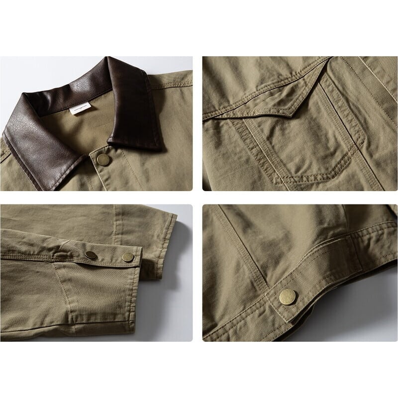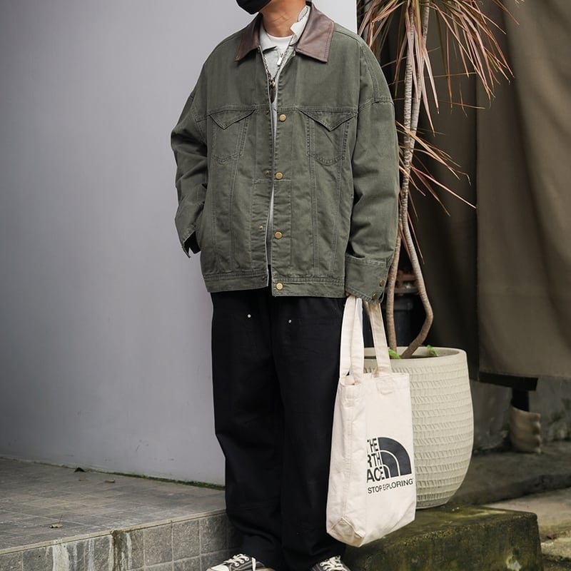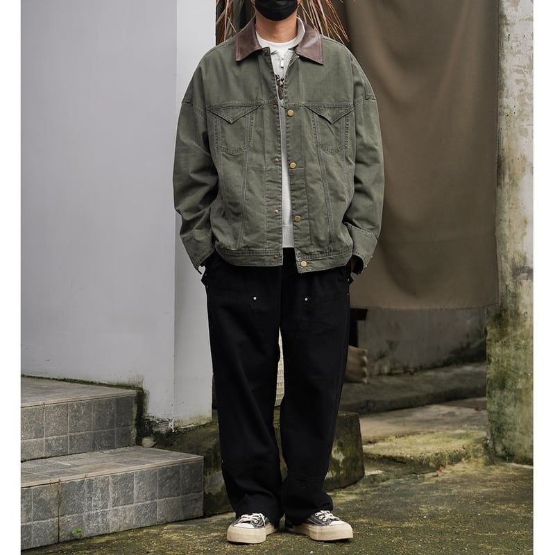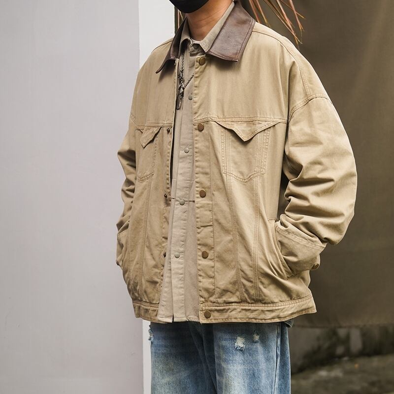 【商品管理番号】 M0472 【商品説明】 襟をフェイクレザーで仕立てた、絶妙なヴィンテージ風スタイルがこなれたドロップショルダージャケットです。ツートーンにあしらったクレリックカラーが個性的な印象を与える一着。カジュアルなスタイルから、ちょっとしたお出かけまで幅広くコーディネートできるアイテムです。着こなしの幅を広げる、使い勝手の良いジャケットです。 GREEN/BEIGE 【サイズ】 【M】肩幅:69cm / 胸囲:130cm / 着丈:68.5cm / 袖丈:52cm 【L】肩幅:71.5cm / 胸囲:135cm / 着丈:72cm / 袖丈:53cm 【XL】肩幅:73cm / 胸囲:138cm / 着丈:74cm / 袖丈:54cm 【2XL】肩幅:75.5cm / 胸囲:144cm / 着丈:76cm / 袖丈:55cm ※サイズは測り方により1-3㎝の誤差が生じる場合がございます。 【素材】 cotton100%