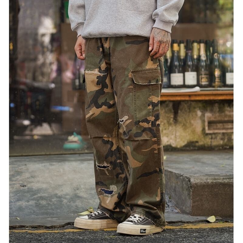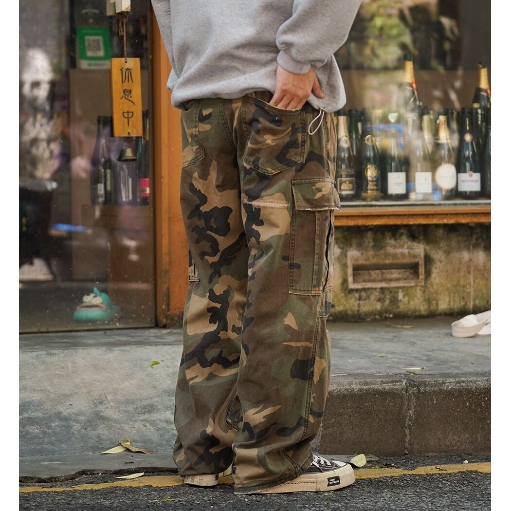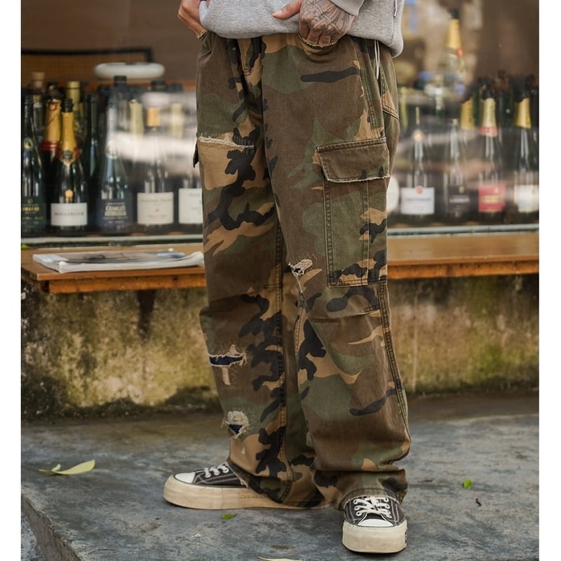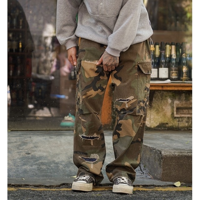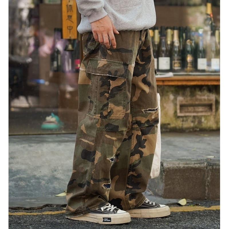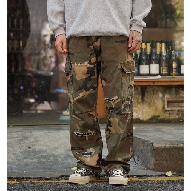 【商品管理番号】 M0451 【商品説明】 カモフラージュ柄が特徴的なワイドシルエットのカーゴパンツです。ヴィンテージ調のダメージ加工が魅力的な一枚。カジュアルなスタイルからアウトドアイベントまで、幅広いシーンで活躍します。シンプルなデザインなので、様々なトップスと簡単にコーディネートでき、自分だけのスタイルを楽しむことができます! GREEN 【サイズ】 【S】 ウエスト:76cm / 着丈:100cm / ヒップ:106cm / 裾まわり:46cm 【M】 ウエスト:80cm / 着丈:102cm / ヒップ:110cm / 裾まわり:47cm 【L】 ウエスト:84cm / 着丈:104cm / ヒップ:114cm / 裾まわり:48cm 【XL】 ウエスト:88cm / 着丈:106cm / ヒップ:118cm / 裾まわり:59cm 【2XL】 ウエスト:90cm / 着丈:108cm / ヒップ:122cm / 裾まわり:60cm ※サイズは測り方により1-3㎝の誤差が生じる場合がございます。 【素材】 cotton100%