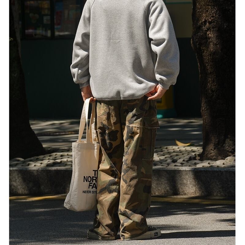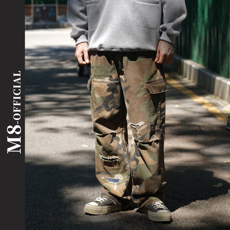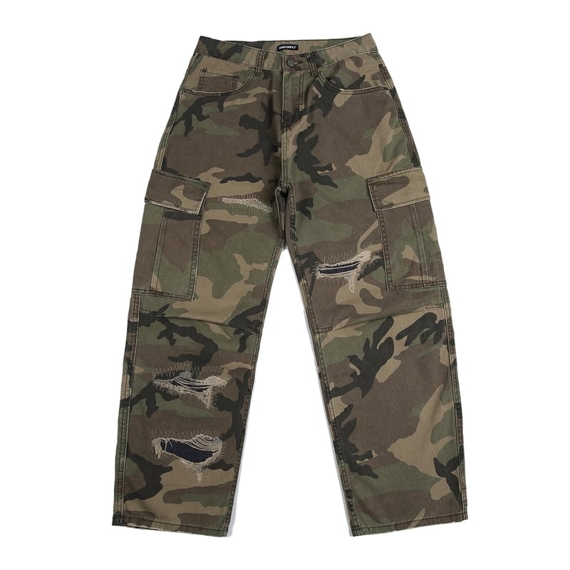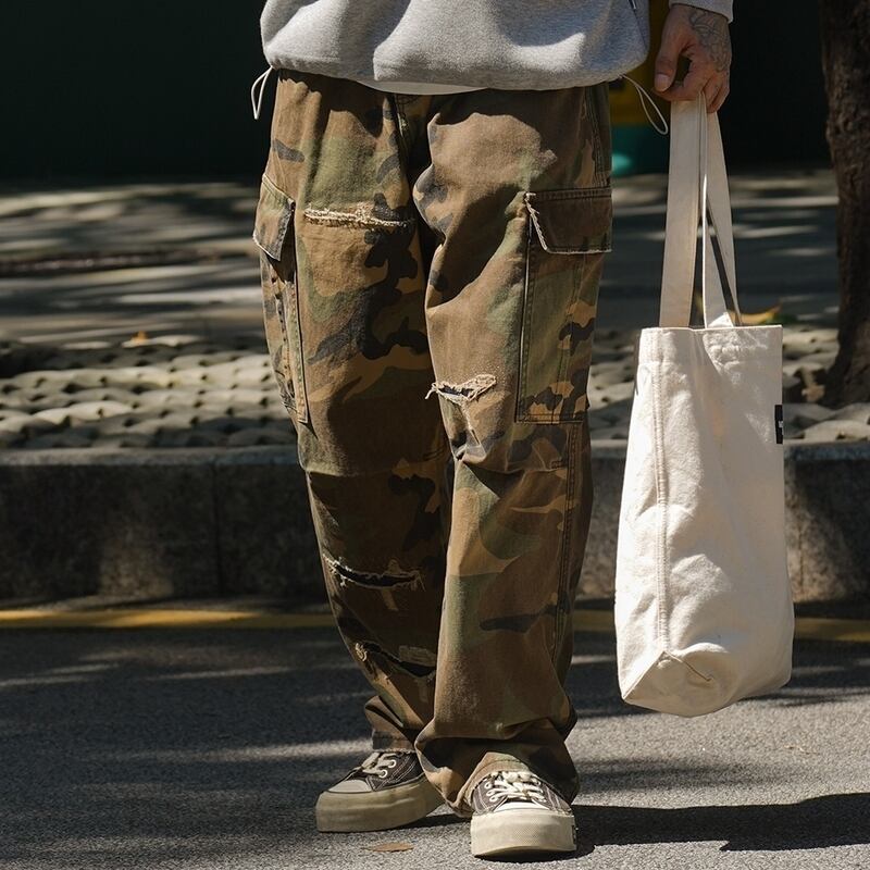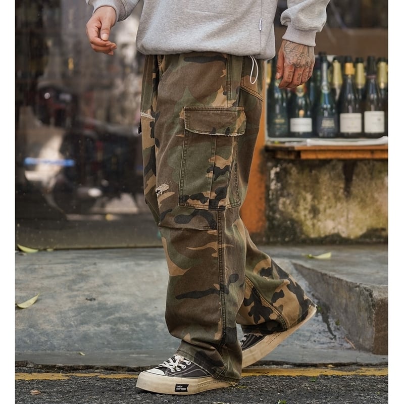 【商品管理番号】 M0451 【商品説明】 カモフラージュ柄が特徴的なワイドシルエットのカーゴパンツです。ヴィンテージ調のダメージ加工が魅力的な一枚。カジュアルなスタイルからアウトドアイベントまで、幅広いシーンで活躍します。シンプルなデザインなので、様々なトップスと簡単にコーディネートでき、自分だけのスタイルを楽しむことができます! GREEN 【サイズ】 【S】 ウエスト:76cm / 着丈:100cm / ヒップ:106cm / 裾まわり:46cm 【M】 ウエスト:80cm / 着丈:102cm / ヒップ:110cm / 裾まわり:47cm 【L】 ウエスト:84cm / 着丈:104cm / ヒップ:114cm / 裾まわり:48cm 【XL】 ウエスト:88cm / 着丈:106cm / ヒップ:118cm / 裾まわり:59cm 【2XL】 ウエスト:90cm / 着丈:108cm / ヒップ:122cm / 裾まわり:60cm ※サイズは測り方により1-3㎝の誤差が生じる場合がございます。 【素材】 cotton100%