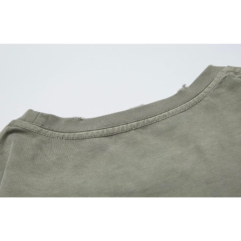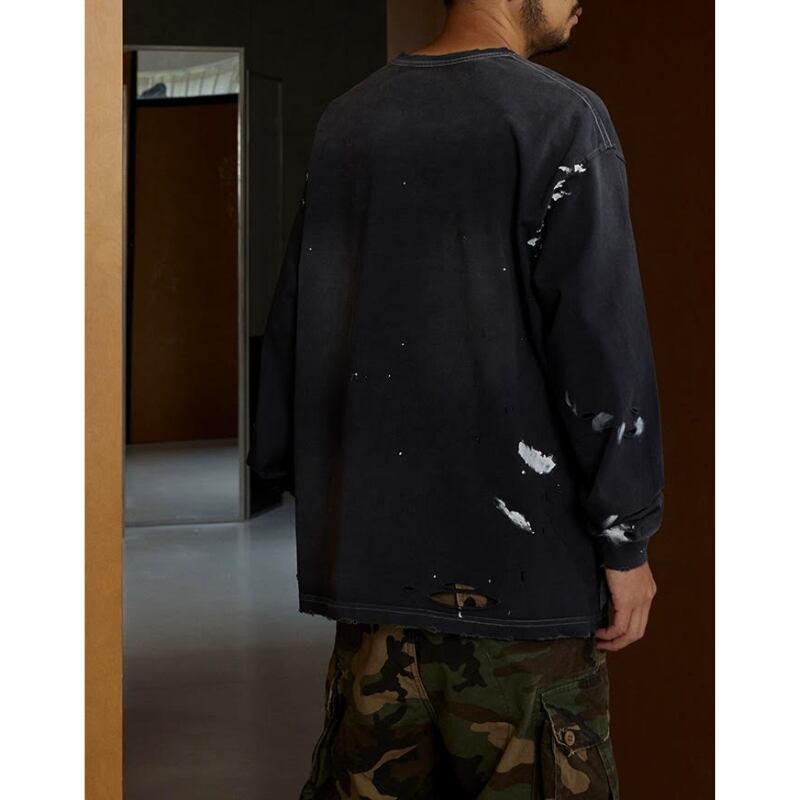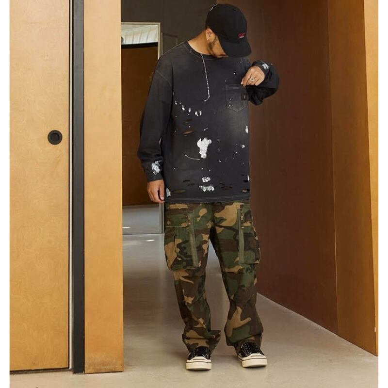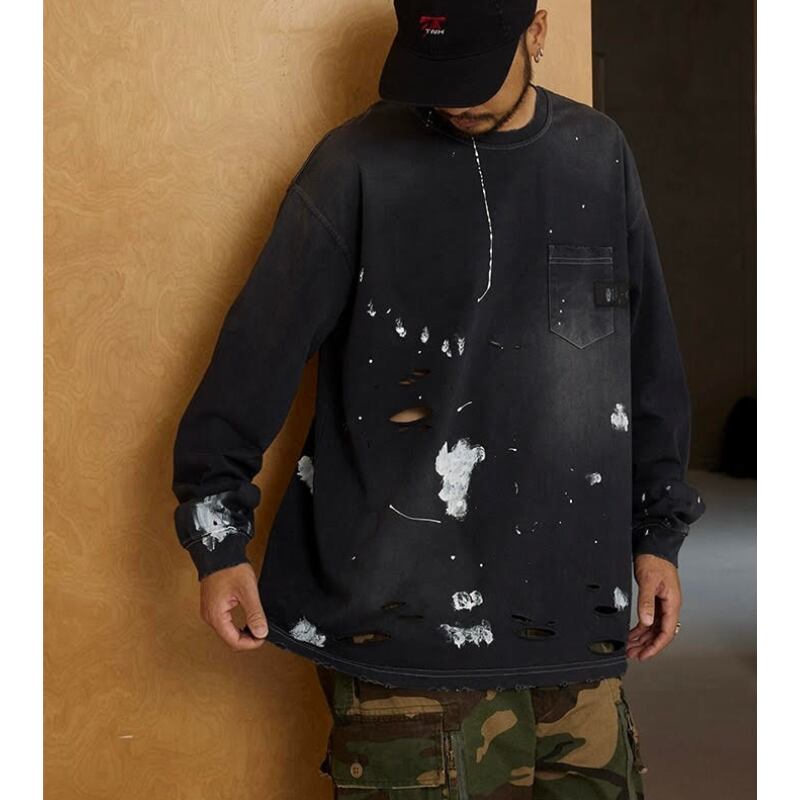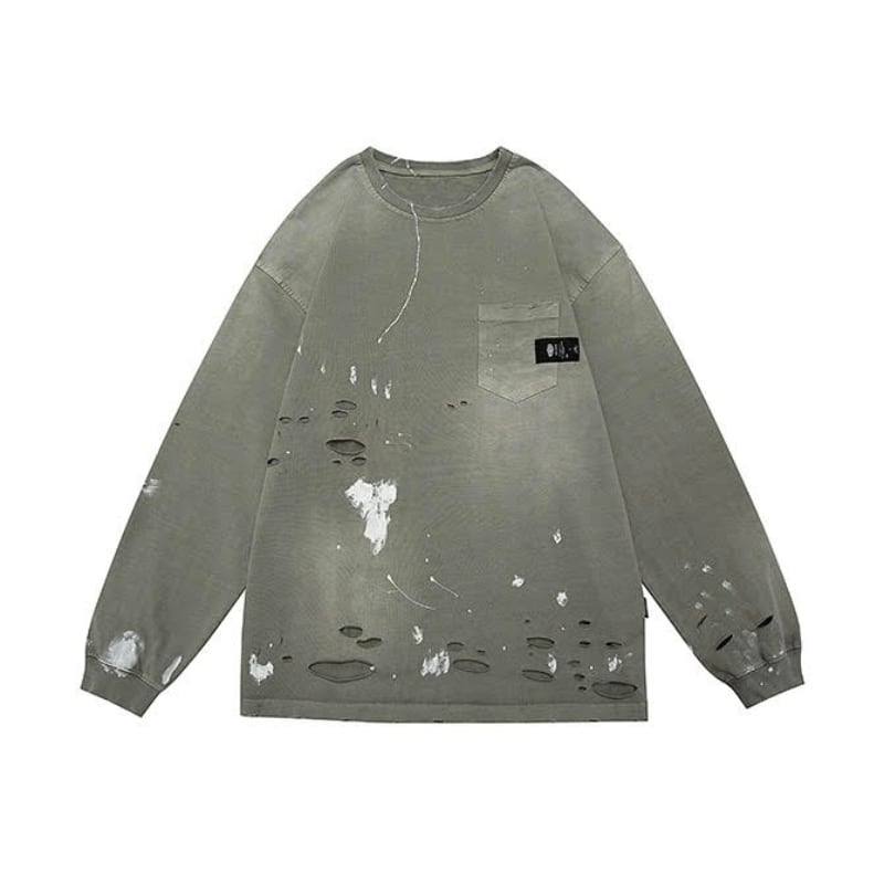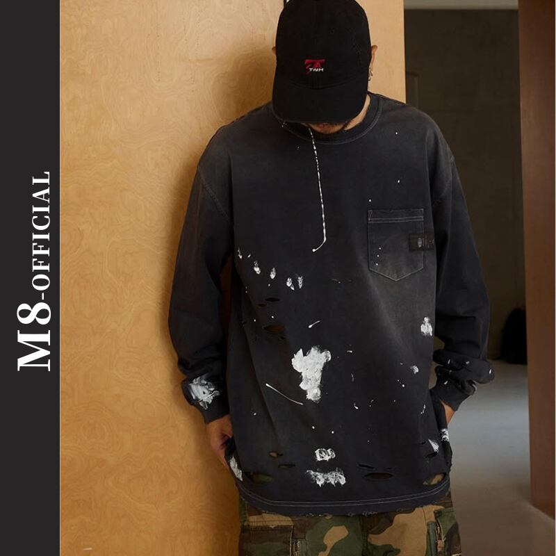 【商品管理番号】 M0561 【商品説明】 胸ポケット付きのダメージ加工が施された長袖Tシャツです。 カジュアルなデザインで、どんなスタイルにも合わせやすい一着。 こなれ感のある着こなしを楽しめるアイテムです。 BLACK/GREEN 【サイズ】 【S】胸囲:120cm / 着丈:72cm 【M】胸囲:124cm / 着丈:74cm 【L】胸囲:128cm / 着丈:76cm 【XL】胸囲:132cm / 着丈:78cm モデル身長:173㎝/体重:63㎏/着用サイズ:Sサイズ ※サイズは測り方により1-3㎝の誤差が生じる場合がございます。 【素材】 cotton100%