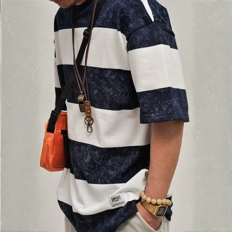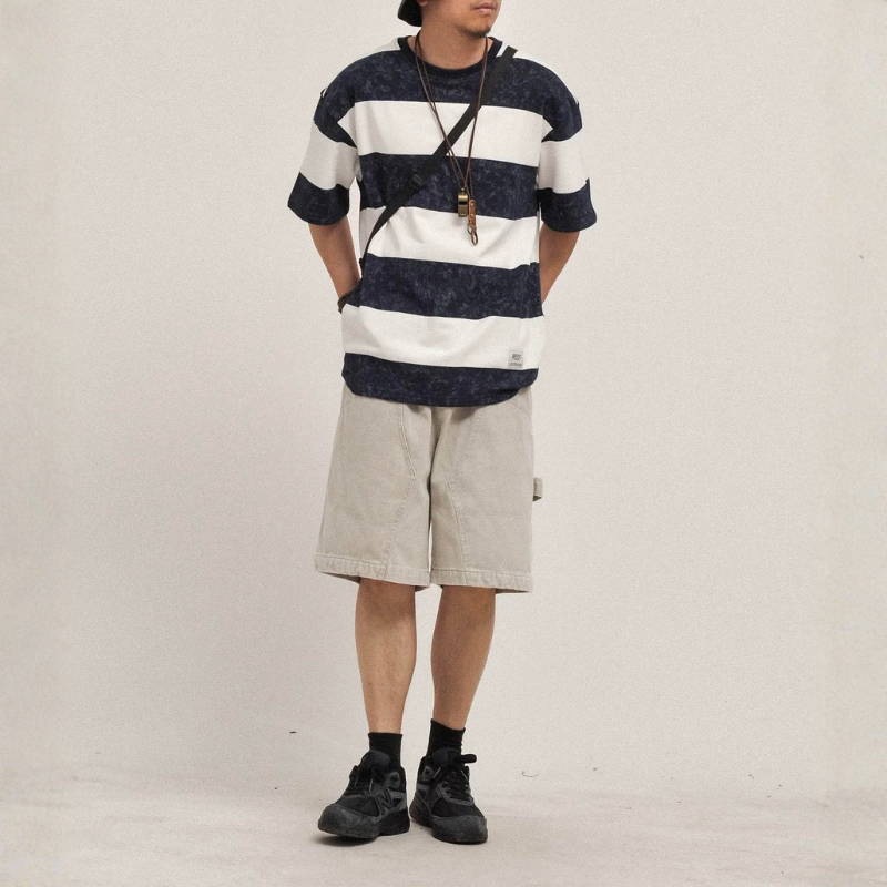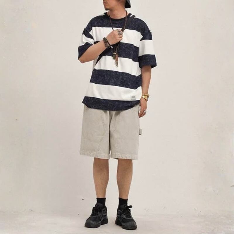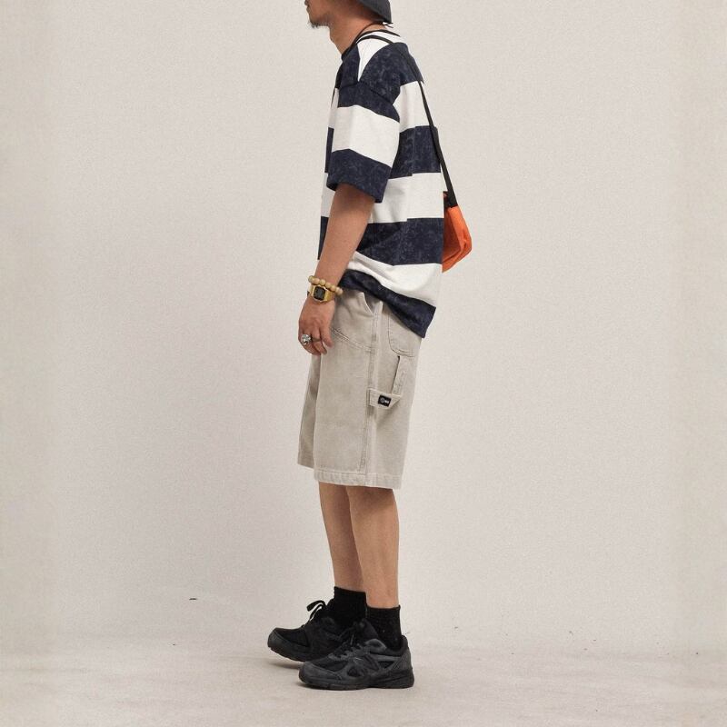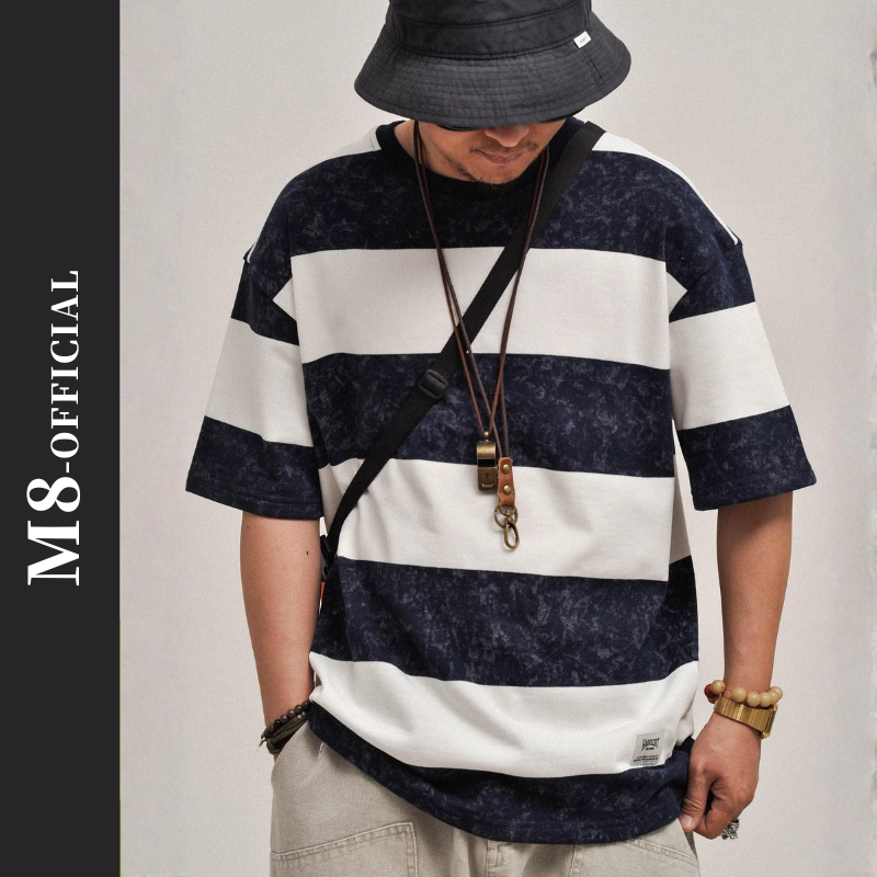 【商品管理番号】 M0635 【商品説明】 カジュアルなスタイルにぴったりなボーダー柄の半袖Tシャツです。ラウンドネックデザインが特徴で、どんなコーディネートにも合わせやすく、デイリーユースに最適な一着です。シンプルながら個性的なボーダー柄が、あなたのスタイルを引き立てます。 NAVY 【サイズ】 【M】肩幅:54cm / 胸囲:116cm / 着丈:71cm / 袖丈:23cm 【L】肩幅:56cm / 胸囲:120cm / 着丈:73cm / 袖丈:24cm 【XL】肩幅:57cm / 胸囲:124cm / 着丈:75cm / 袖丈:25cm 【2XL】肩幅:59cm / 胸囲:128cm / 着丈:77cm / 袖丈:26cm ※サイズは測り方により1-3㎝の誤差が生じる場合がございます。 【素材】 cotton100%