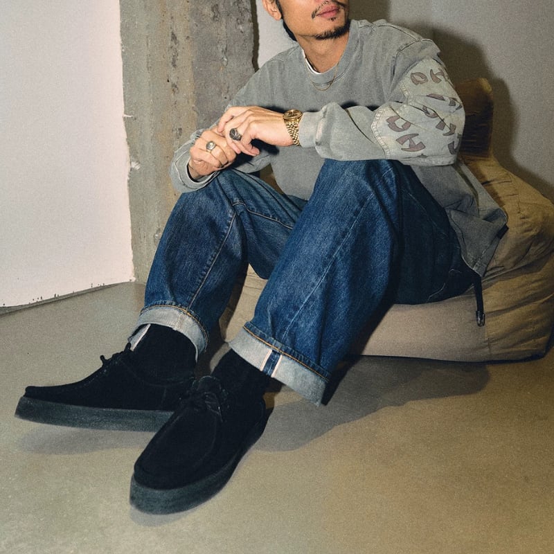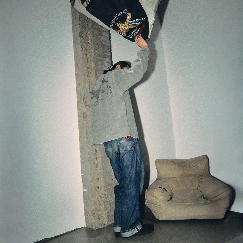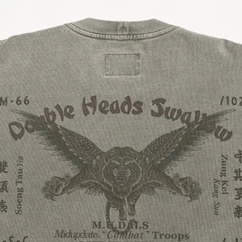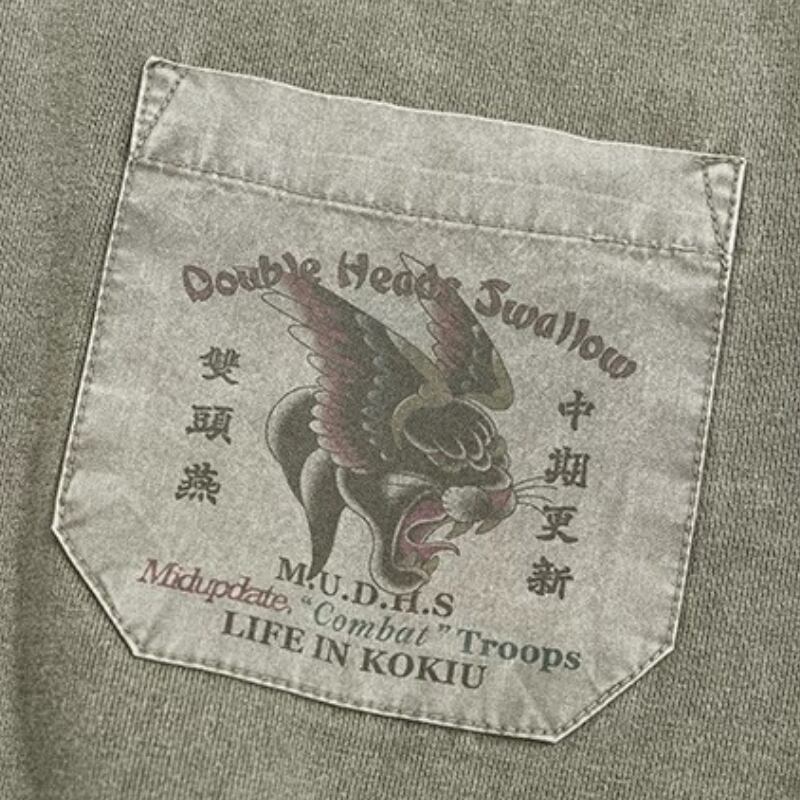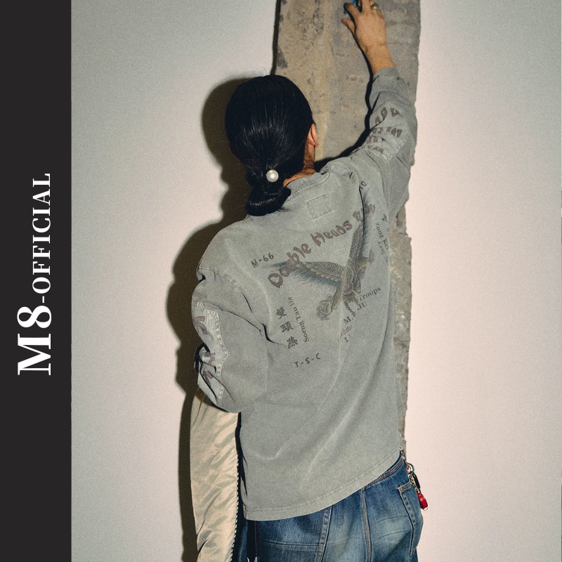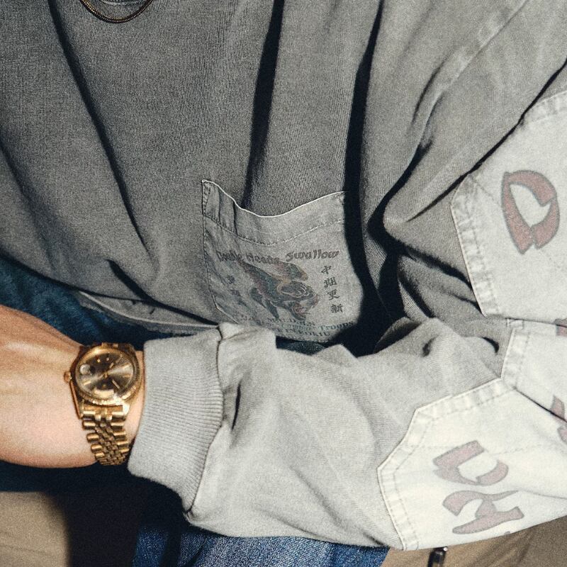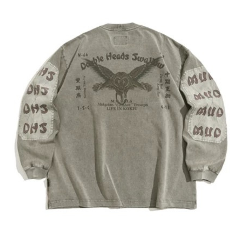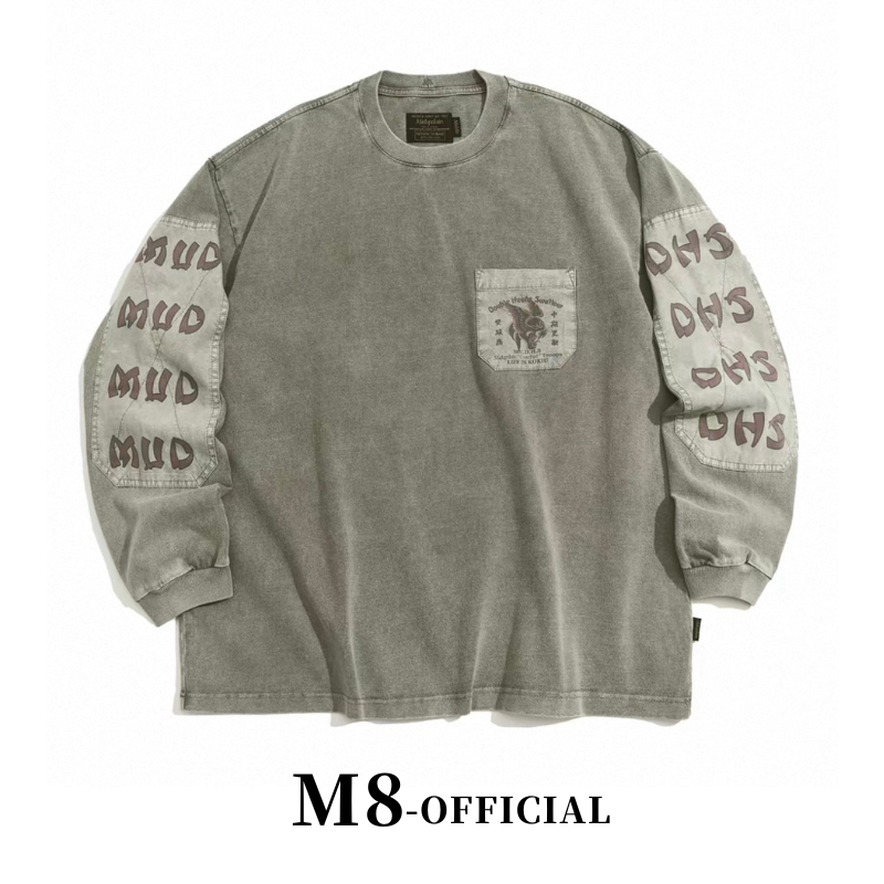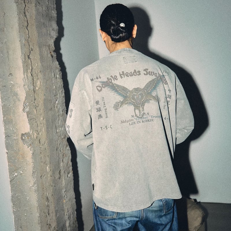 胸ポケットと袖の切り替えを組み合わせたデザインが特徴のロングスリーブ。前後に配置されたグラフィックが視線を引きつけ、シンプルながら印象に残る仕上がり。ウォッシュ感のある表情で、スタイリングの主役になる一枚です。