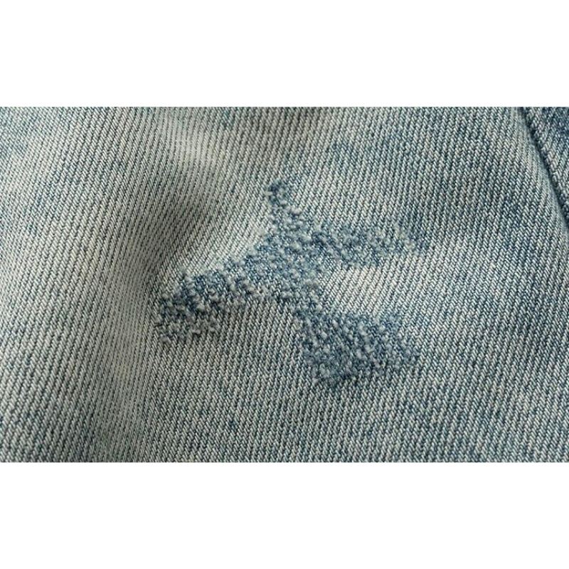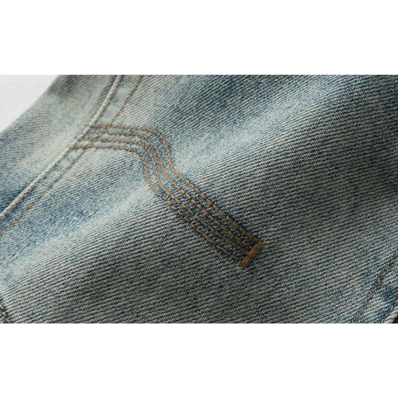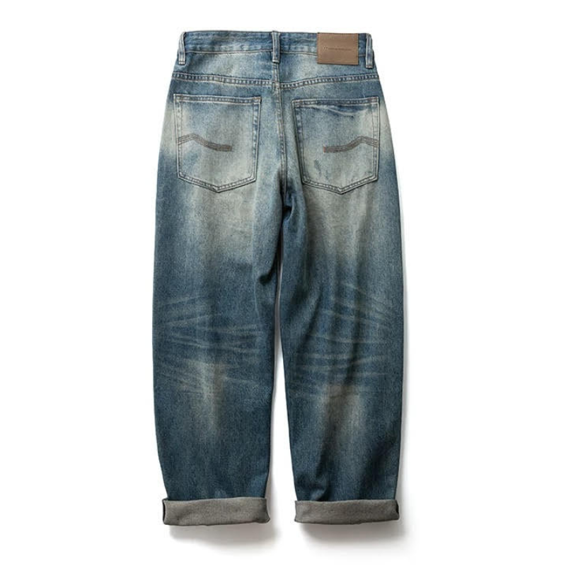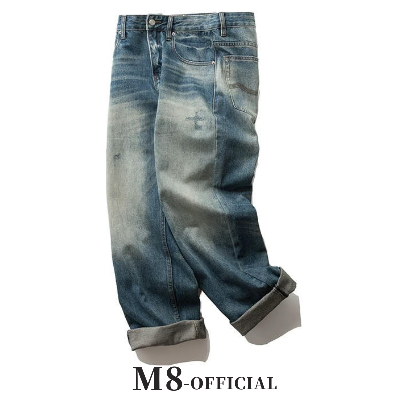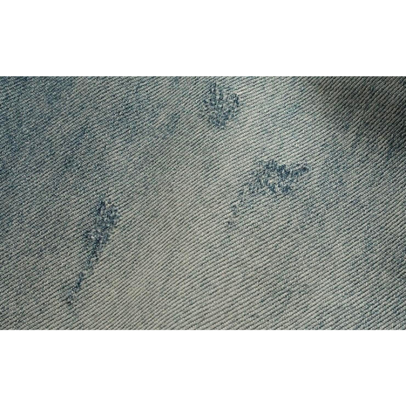 ダメージ加工が施されたカジュアルなワイドレッグデニムパンツです。ゆったりとしたシルエットが魅力で、リラックスした着心地を実現します。デイリーユースにも最適なこの一着は、どんなスタイルにも合わせやすく、様々なシーンで活躍します。